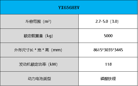 产品定位:YX656HEV混合动力电动装载机额定载重量5000kg,大开档铰接设计,3300mm长轴距配置。采用国四集成式高效增程器,无需添加尿素,大幅度降低燃油消耗,降低使用成本。混合动力装载机具有节能、高效、智慧、舒适的特点,适用于砂石料、煤炭、港口等作业场景。