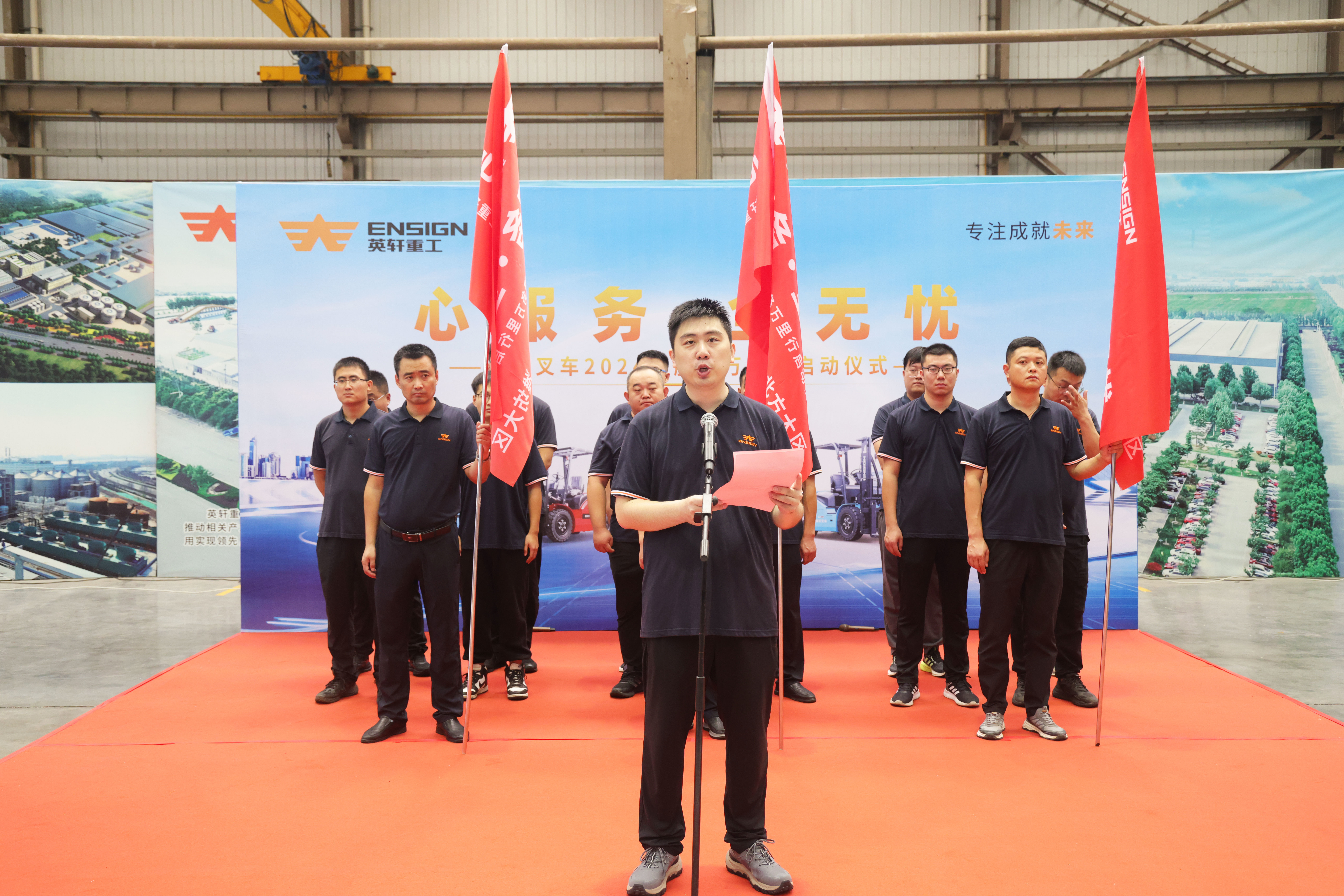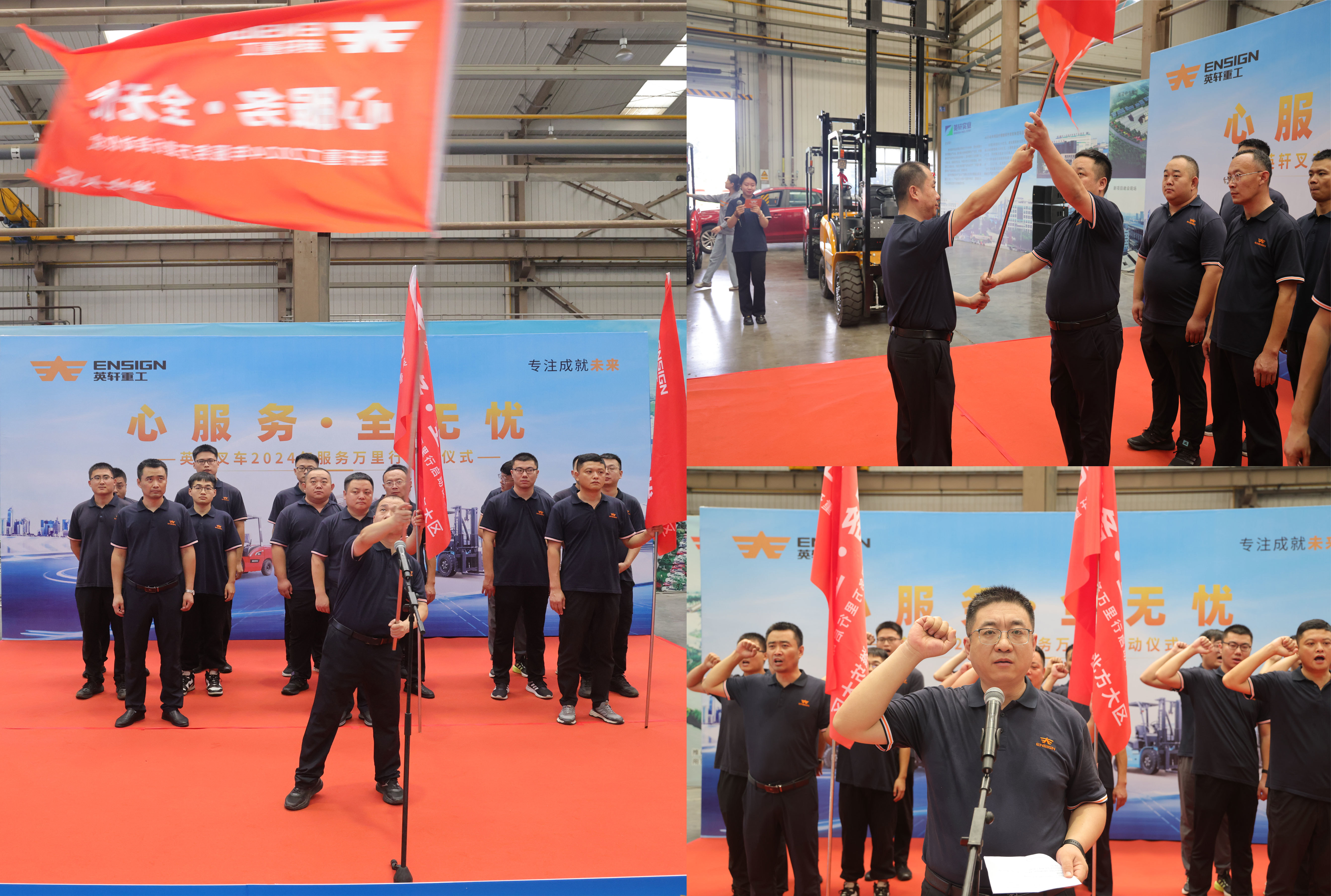 旌旗猎猎,整装待发!怀揣打造“致力于打造行业内最可信赖的品牌”的坚定决心,潘总将象征责任与荣誉的服务战旗交到各战区负责人手中,李部长带领“战士们”进行庄严宣誓:“严格遵守公司要求,以客户满意为目标……。”铿锵有力的誓言,不仅代表了英轩叉车服务质量行的信心和决心,更是对服务精神理念的深化和弘扬。